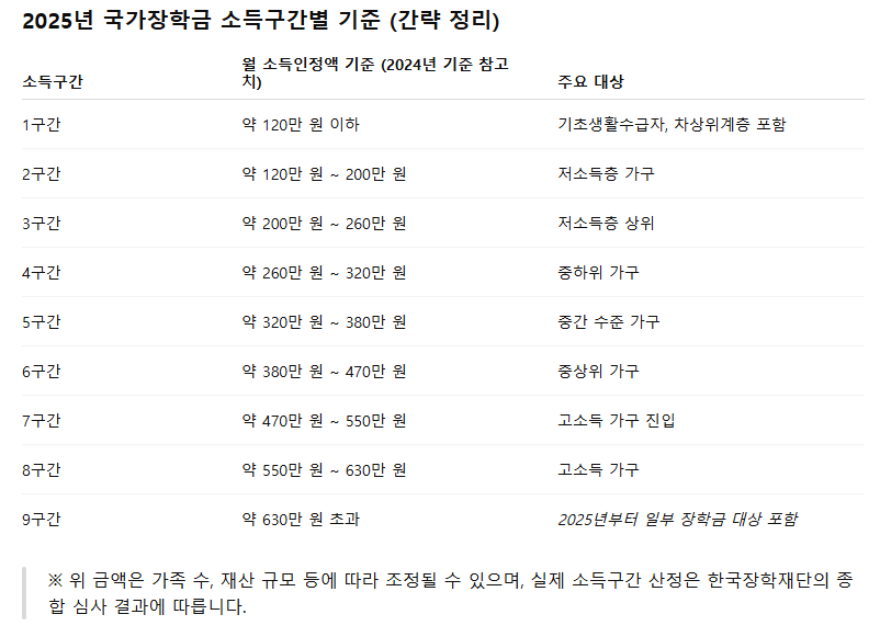 2구간은 약 120만 원에서 200만 원 사이, 3구간은 약 200만 원에서 260만 원 사이의 월 소득을 가진 가구가 대상입니다. 이어서 4구간은 260만 원에서 320만 원, 5구간은 320만 원에서 380만 원, 6구간은 380만 원에서 470만 원, 7구간은 470만 원에서 550만 원, 8구간은 550만 원에서 630만 원 수준입니다. 그리고 2025년부터는 기존의 지원 기준이었던 8구간을 넘어 9구간(630만 원 초과)도 일부 장학금 대상에 포함됩니다.