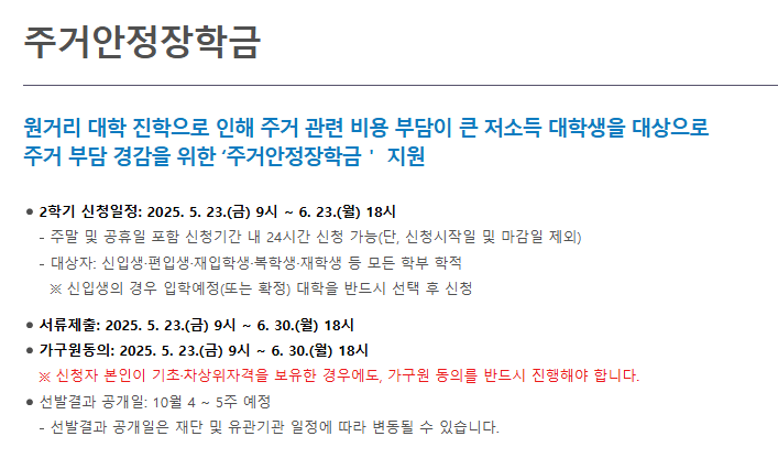 주거안정장학금: 기초·차상위 계층 대학생의 주거비 부담을 줄이기 위한 장학금으로 새롭게 신설되었습니다. 별도 신청 없이 국가장학금 신청 시 연계하여 지원됩니다.