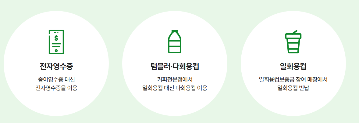 다회용컵(텀블러) 이용: 커피전문점 등에서 텀블러를 사용해 음료를 구매하면 포인트가 지급됩니다.