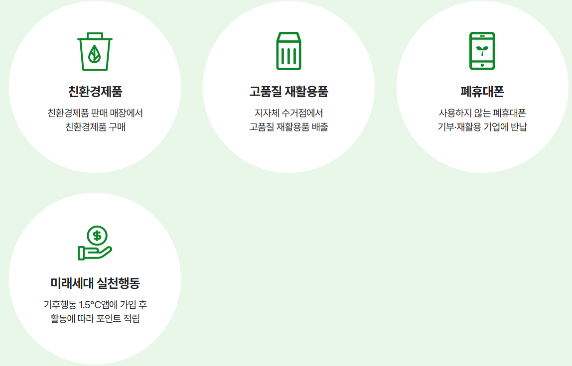 고품질 재활용품 배출: 지정된 장소에서 플라스틱, 캔 등 고품질 재활용품을 분리배출하면 포인트를 받을 수 있습니다.