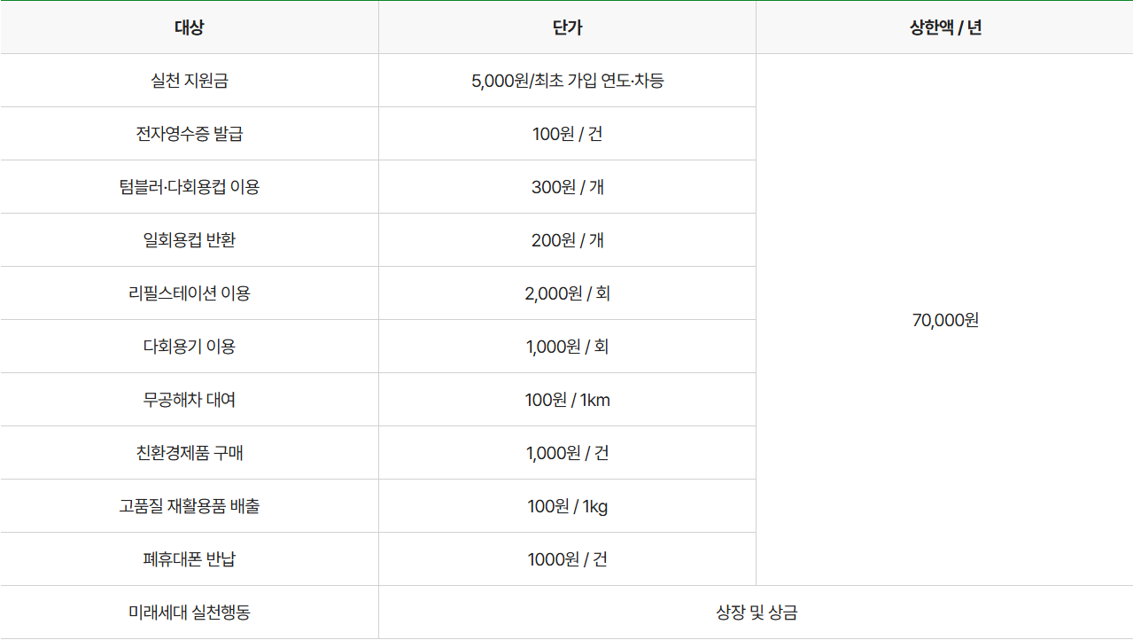 실천지원금(최대5,000원)과 텀블러,다히용컵, 전자용수증등 자주 하는 항목을 꾸준히 실천하면 연간 최대7만원을 어렵지 않게 채울 수 있습니다.