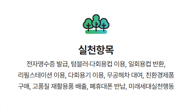 각 실천 항목은 참여 매장, 앱, 웹사이트 등에서 자동으로 기록되거나, 영수증 인증, 앱 내 활동 인증 등 다양한 방식으로 참여 내역을 확인하고 포인트를 적립할 수 있습니다.