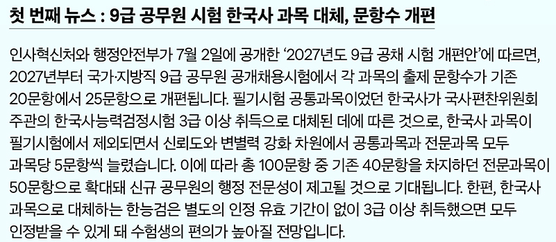 이 개편안에는 필기시험 과목 구성과 문항 수, 그리고 한국사 과목의 폐지와 한국사능력검정시험(한능검) 도입이 포함되어 있어 수험 전략에 큰 영향을 미칠 것으로 보입니다.