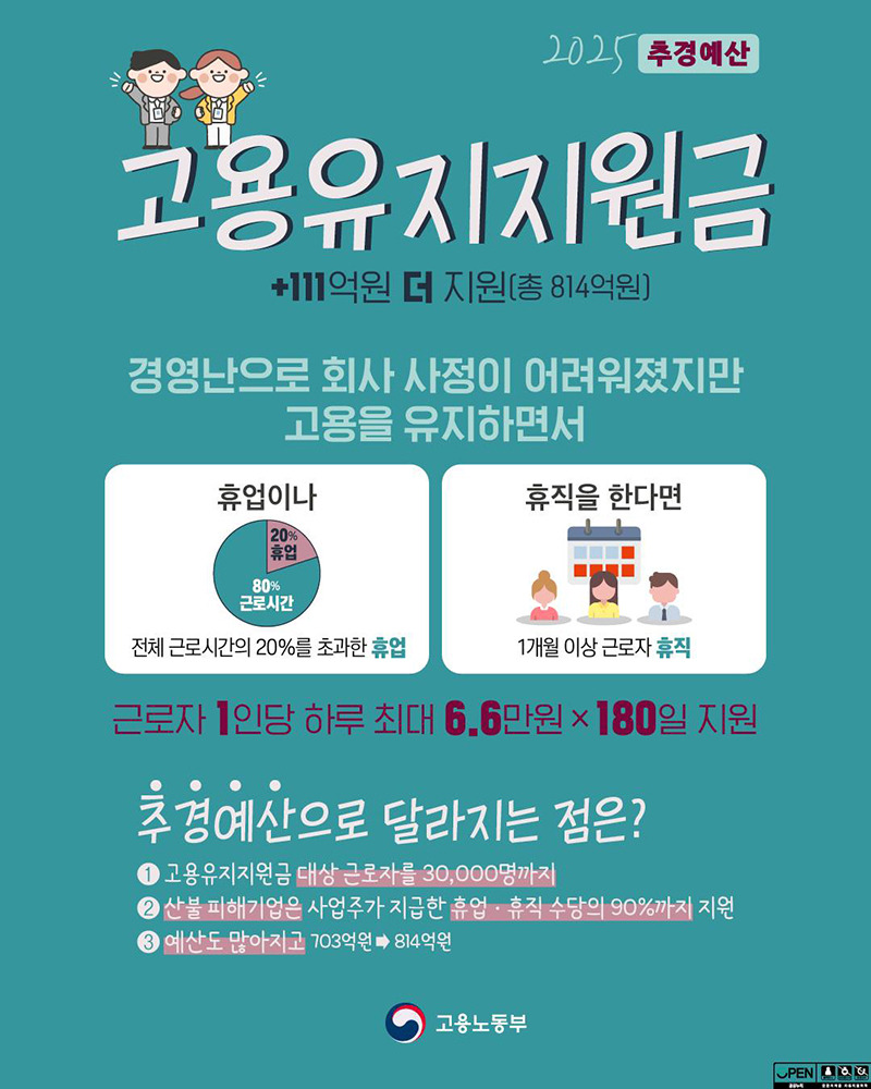 기업이 어려운 시기를 버티며 소중한 일자리를 지켜낼 수 있도록 돕는 제도가 바로 고용유지지원금입니다. 특히 2025년에는 정부가 고용유지지원금에 추경 예산 111억 원을 추가 지원하면서 총 예산이 814억 원으로 확대되었습니다.