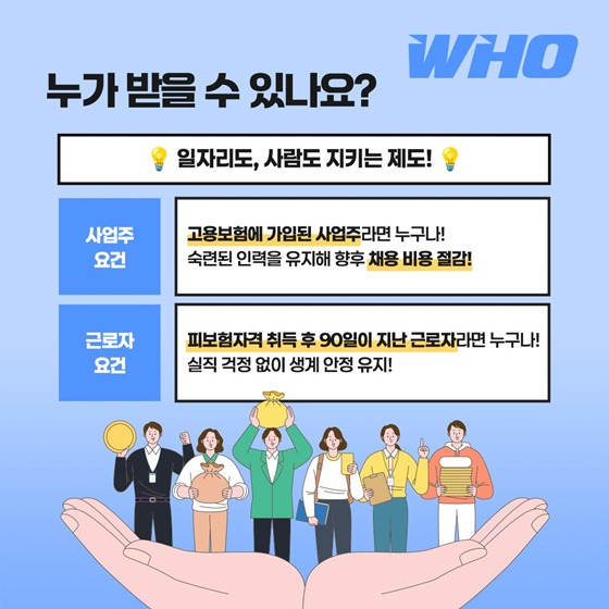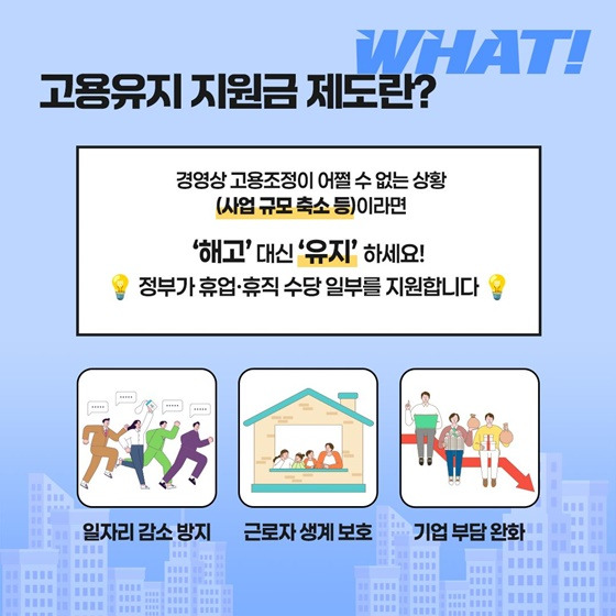 즉, 해고 대신 ‘잠시 쉬게 하며’ 고용을 유지할 수 있도록 비용의 일부를 보전해주는 것입니다.