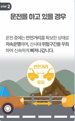 이때 대피는 차량보다는 도보 이동이 빠르고 안전할 수 있으며, 가능한 고지대 또는 산사태 예상 방향과 반대편으로 대피하는 것이 중요합니다.