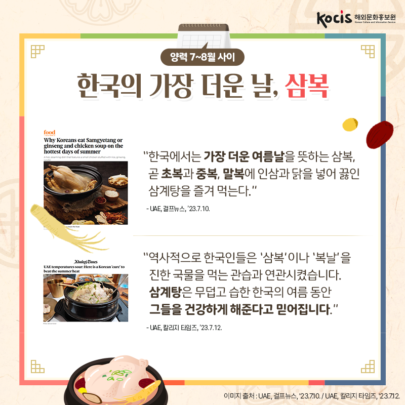 삼복은 본격적인 더위가 시작되는 초복, 1년 중 가장 덥고 지치기 쉬운 정점인 중복, 그리고 무더위가 조금씩 누그러지기 시작하는 말복까지 약 20일간 이어집니다.